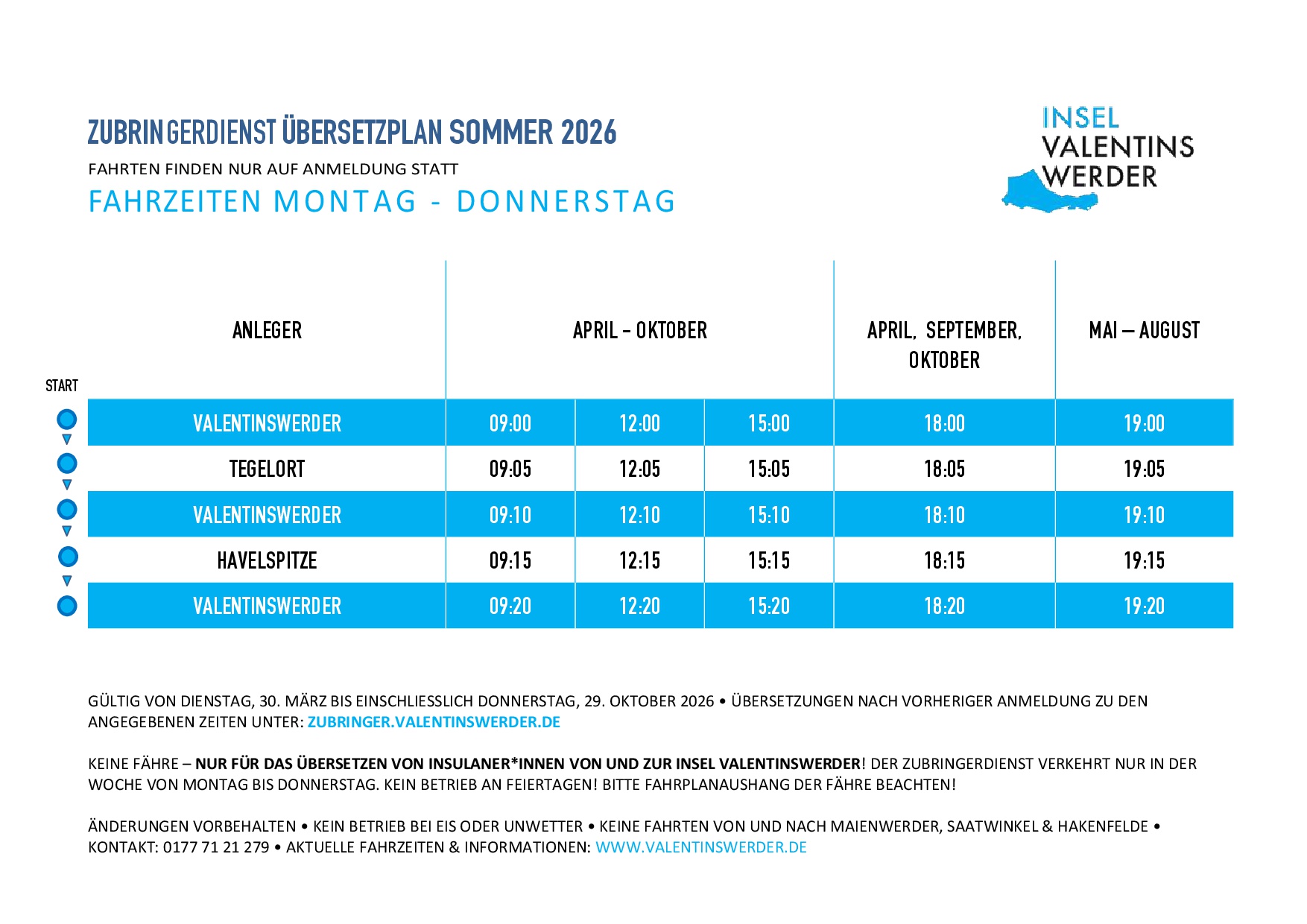 Ab 27.03.2026 gilt der Sommerfahrplan. Der Zubringer verkehrt dann nur noch werktags. Für Wochenend-Überfahrten startet am Freitag (27.03.) die Fährsaison FÄHRE TEGELER SEE