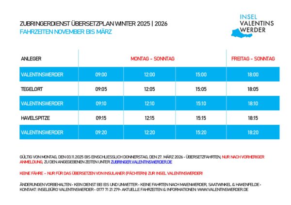 Zubringerfahrten unter der Woche, wenn die Fähre nicht fährt.